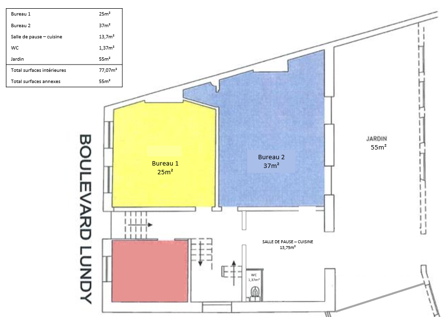 Ces locaux sont composés d'un bureau de 25m², d'un second bureau de 37m², d'une salle de pause / cuisine de 13m² et de toilettes privatives.