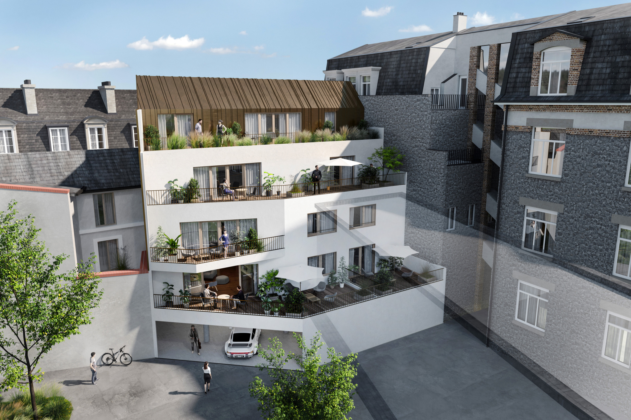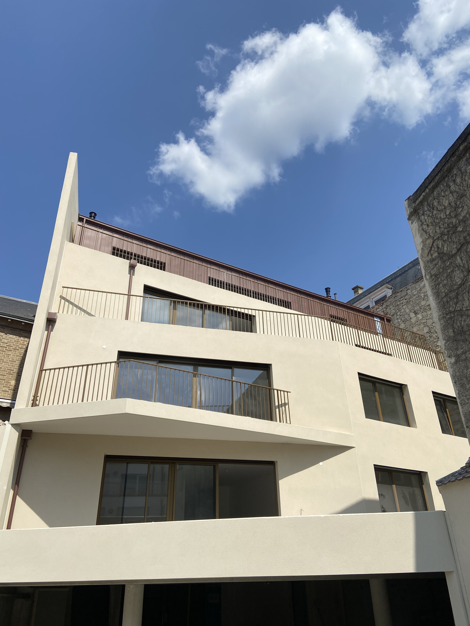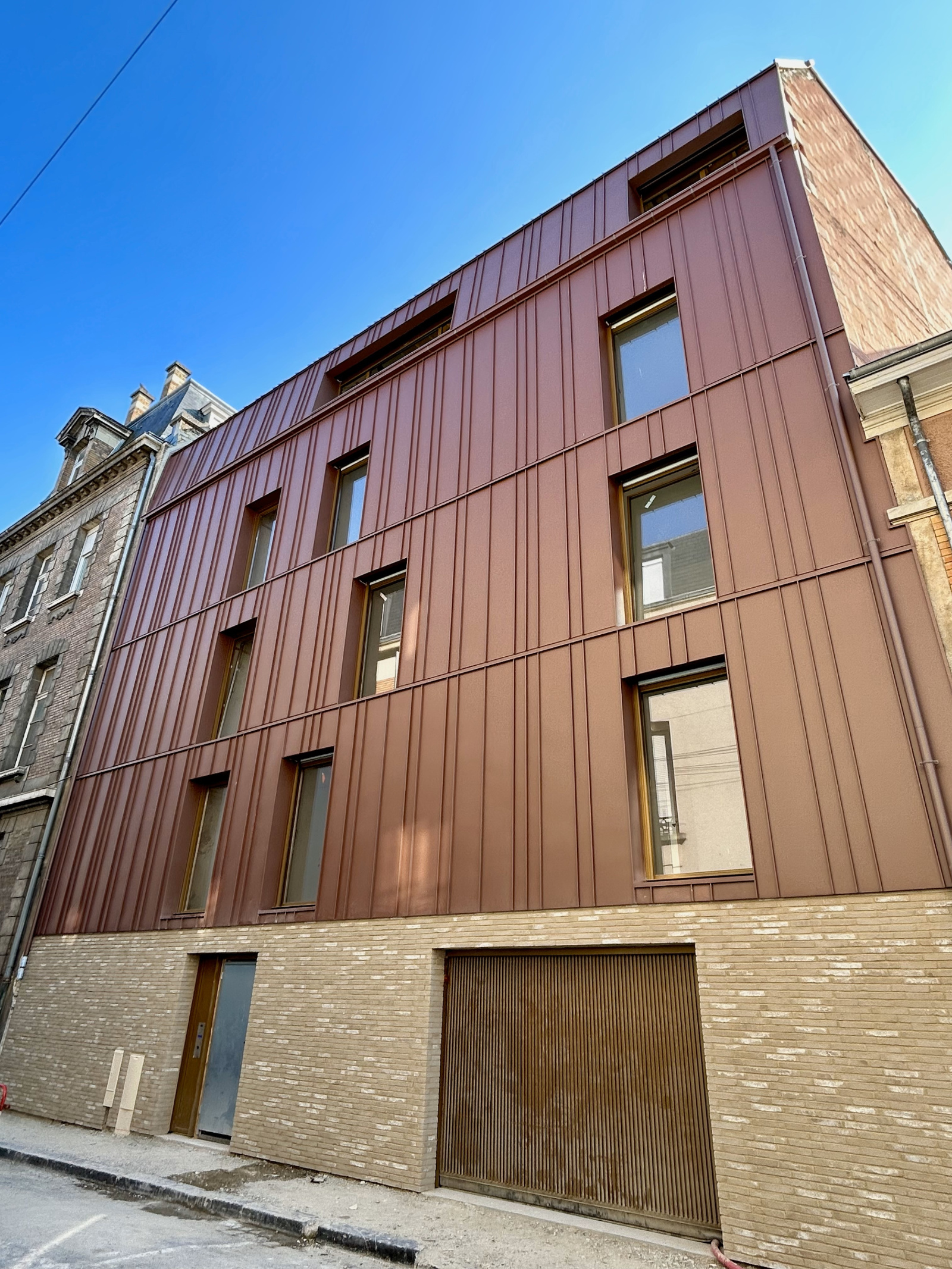 Le bâtiment aux lignes épurées est entièrement dédié à l'habitation. Il présente, sur quatre niveaux, six appartements modernes et fonctionnels, réalisés avec des matières brutes et lumineuses.
