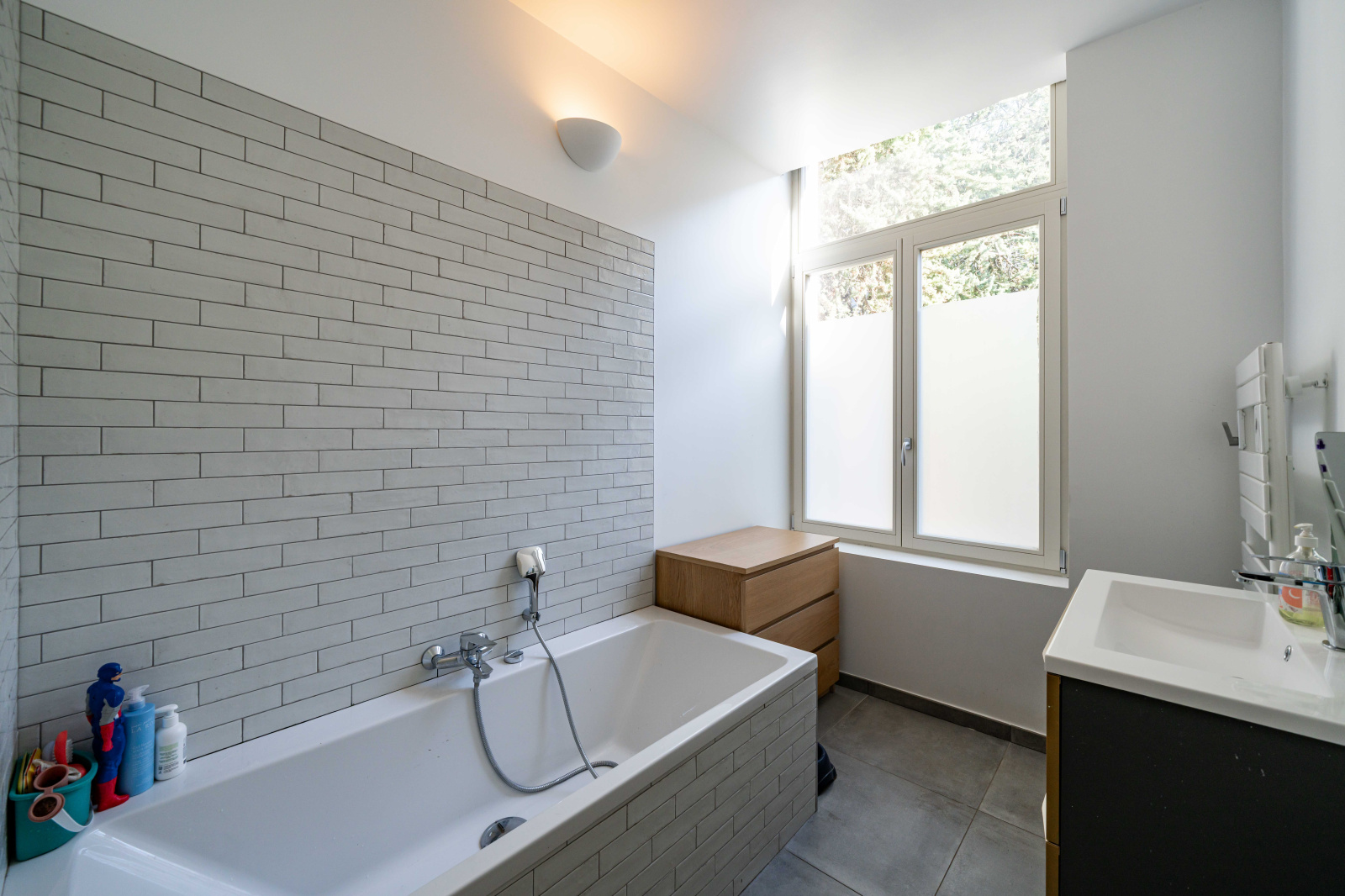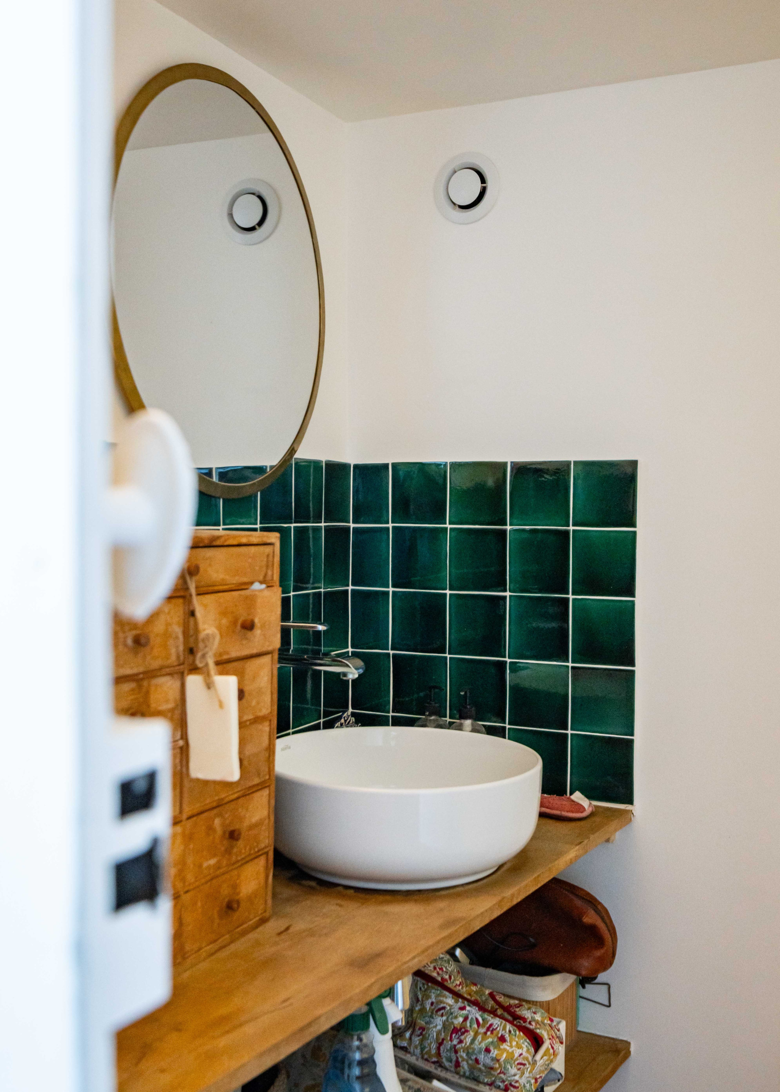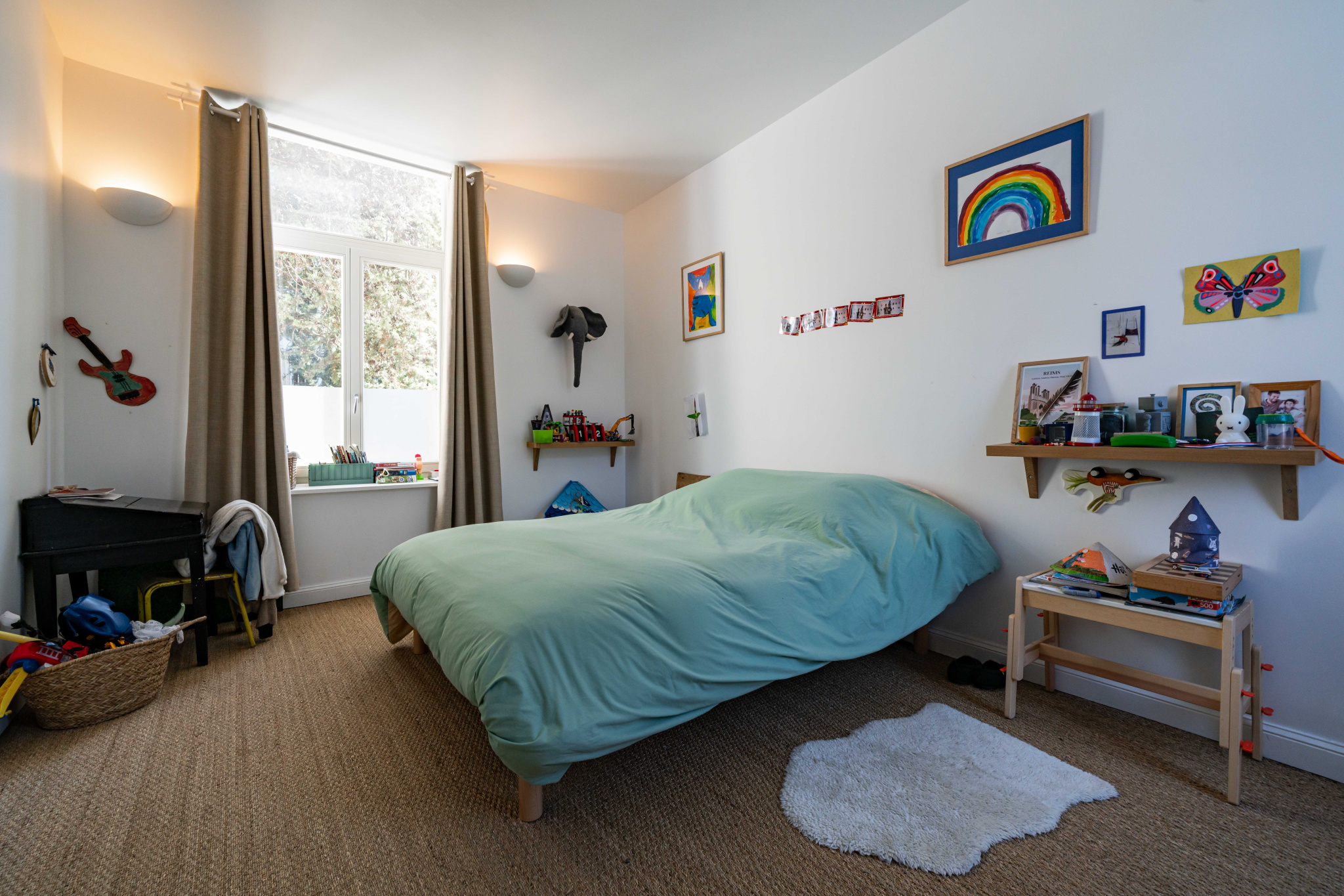 Le niveau inférieur accueille l’espace nuit composé d’une suite parentale avec salle d’eau et dressing, de deux chambres supplémentaires, d’une salle de bains, de toilettes indépendantes et d’un espace buanderie. Les sols alternent parquet ancien et jonc de mer, apportant chaleur et caractère.