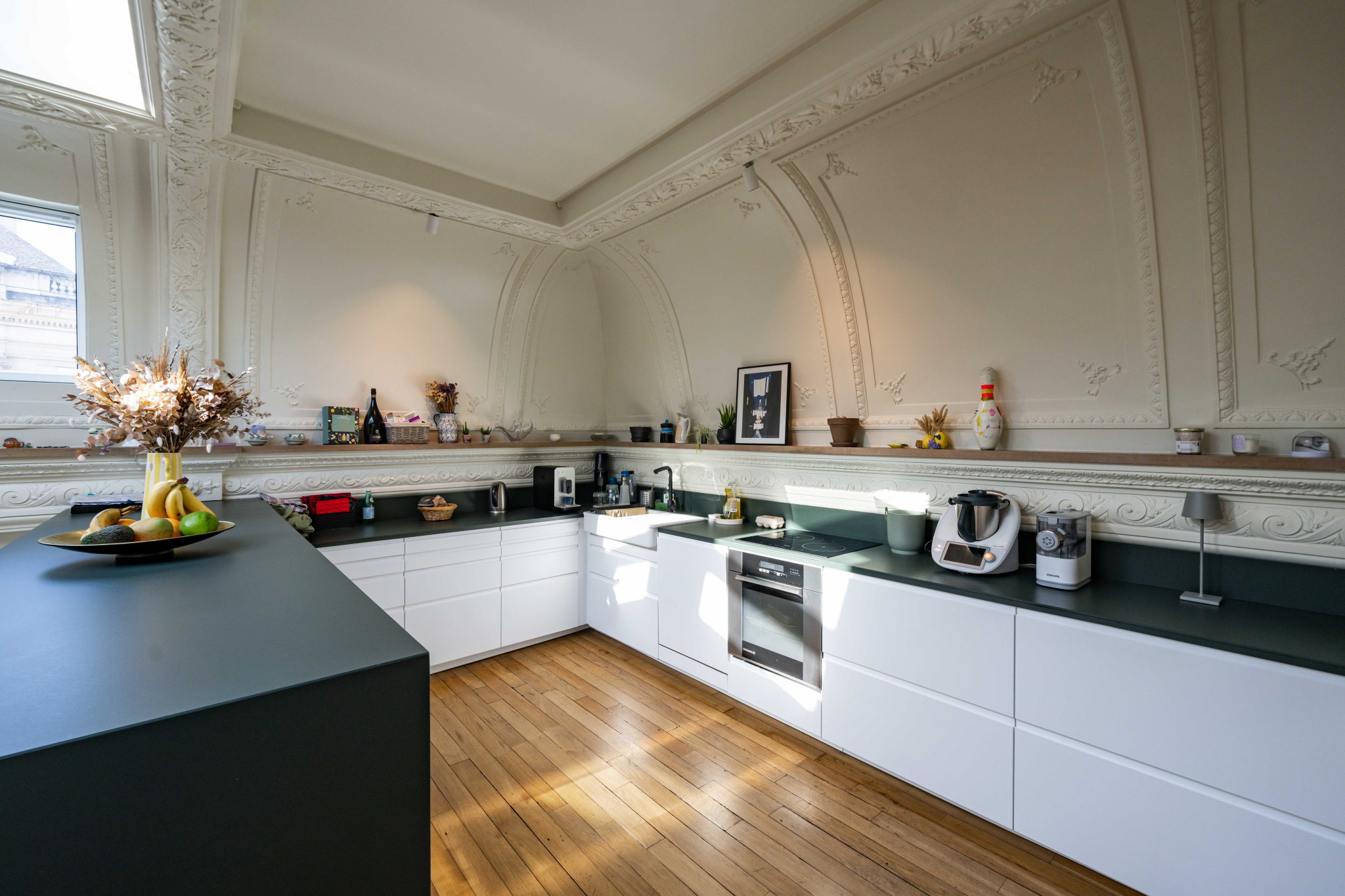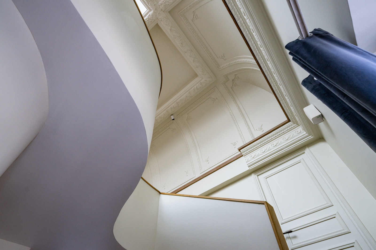 À l’étage, les espaces de réception offrent une atmosphère unique : un salon intimiste précède un spectaculaire séjour d’environ 42 m² avec cuisine ouverte, sublimé par un plafond voûté et de magnifiques moulures aux lignes courbes.